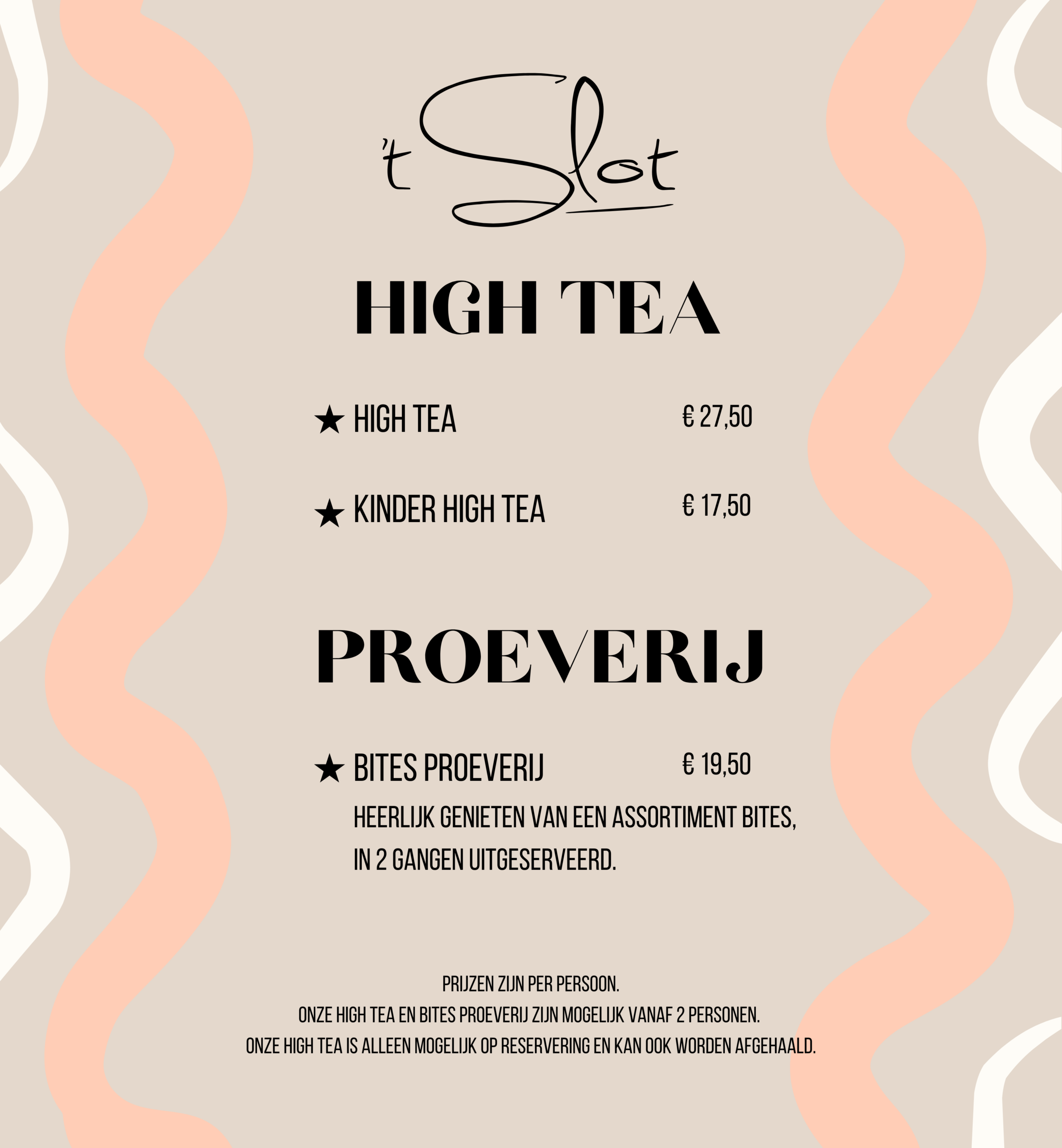 Onze High Tea kan ook afgehaald worden. Wij houden graag rekening met je dieetwensen, zodat iedereen kan genieten van deze lekkere verwennerij! Een High Tea is alleen mogelijk op reservering. In het weekend en tijdens schoolvakanties werken wij met shift tijden, informeer hiernaar bij onze medewerkers.